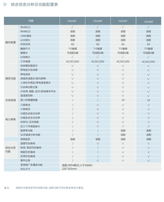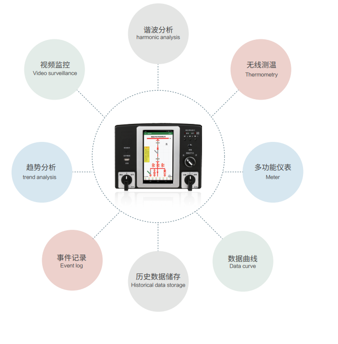 综合状态分析仪是一款集开关柜开关状态监测、接点温度监测、环境温湿度监测及控制、主回路电力参数测量、电能计量、 谐波分析、断路器状态视频监控于一体,该装置显示面板采用 7 寸触摸屏设计,可直观的显示系统模拟图、开关状态、监测的温度、 湿度、电流、电压、功率、谐波等数据,同时可以存储 3 年以上的曲线数据和事件记录,现场可以查看参数的运行曲线、事件记录、 以及一系列的数据统计分析,并可通过 USB 接口将数据导出或将系统配置导入,该装置可配置 2 路摄像头,对柜内断路器等设 备进行视频实时监控。装置可带 2 路 RS485 通信接口和一路以太网通讯接口实现数据上传接入自动化系统中。